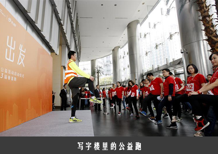 3月10日,参加公益垂直跑的选手在教练带领下做准备活动。当日,300多名在上海浦东新区中建大厦工作的各公司白领参加一场在大楼里举行的公益垂直健康跑活动,每位完成垂直跑全程的选手将为希望小学的孩子们募得50元,所得善款将用于为中国海外捐助的11所希望小学购买急救设备等。